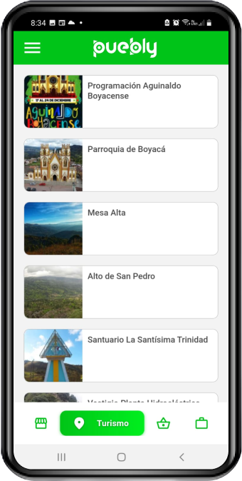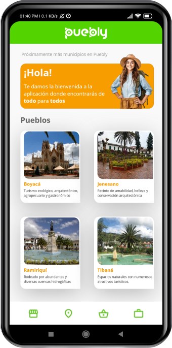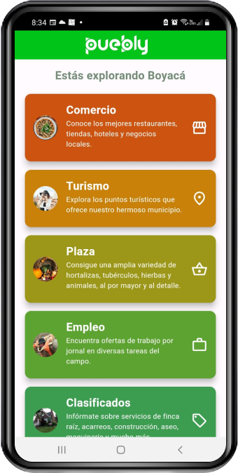 Puebly es una aplicación desarrollada para impulsar la economía rural sostenible de los municipios, inicialmente en el departamento de Boyacá a través de siete secciones accesibles para los habitantes y turistas, en las cuales se contiene información sobre los diversos sectores de cada pueblo con respecto a comercio, turismo, plaza, empleo, clasificados, comunidad y datos de interés cultural e histórico. Con ello se busca la comercialización de productos y servicios a nivel local, departamental y nacional.