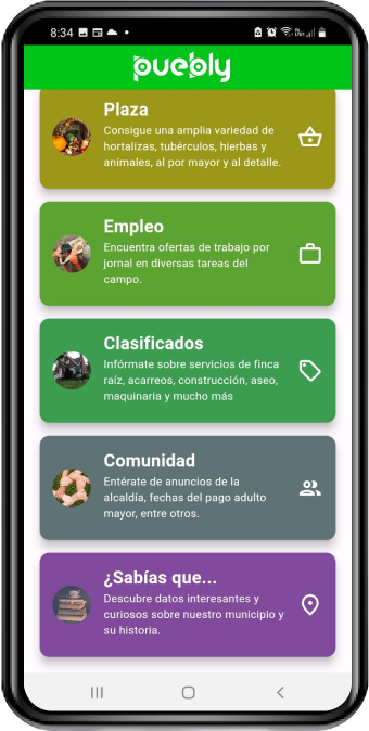 Acceder a cada municipio desde puebly permite explorar a través de siete secciones la información correspondiente a los sectores agropecuario, económico, social y cultural, conociendo la oferta de productos y servicios, empleo, comercios y lugares turísticos.